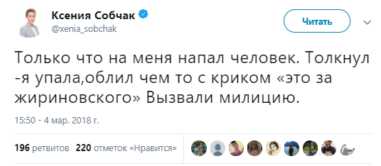 Сегодня, 4 марта, в центре Москвы напали на кандидата в президенты России Ксению Собчак после того, как в эфире одного из российских телеканалов она облила водой Жириновского. О нападении она сообщила на своей странице в Twitter.