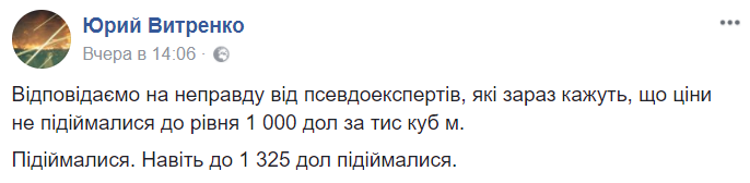 "За сутки "Нафтогаз" заменил газ, который должен поставляться от "Газпрома" на газ из Европы", - написал Витренко в Facebook.