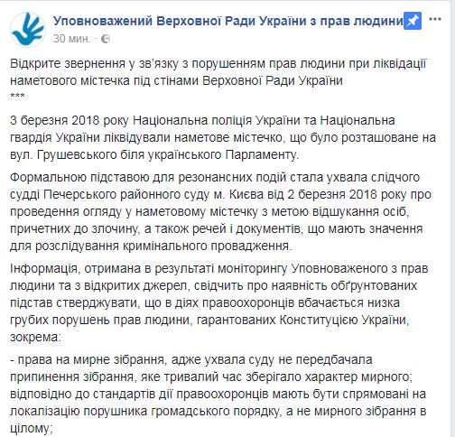 "Информация, полученная в результате мониторинга Уполномоченного по правам человека и из открытых источников, свидетельствует о наличии обоснованных оснований утверждать, что в действиях правоохранителей видится ряд грубых нарушений прав человека, гарантированных Конституцией Украины... Призываем генерального прокурора Украины обеспечить проведение быстрого и эффективного расследования событий, имевших место 3 марта… предусмотрев периодическую публичную отчетность о результатах такого расследования", - сообщается на странице омбудсмена.