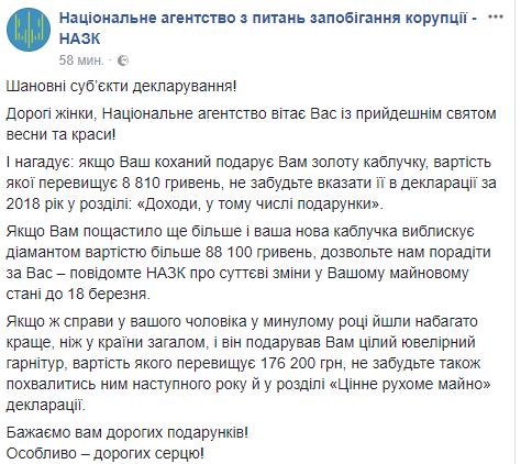 "Дорогие женщины, Национальное агентство поздравляет Вас с грядущим праздником весны  и красоты и напоминает: если Ваш любимый подарит Вам золотой перстенек, стоимость которого превышает 8 810 грн, не забудьте указать его в декларации за 2018 год в разделе: "Доходы, в том числе подарки", - сообщается в соцсети.