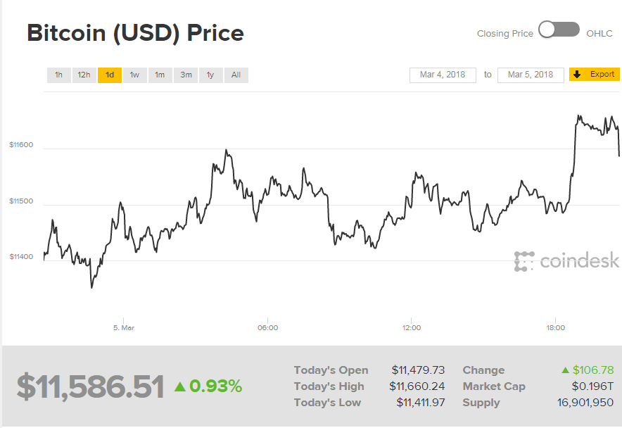 Вечером, 5 марта 2018 курс биткоина (Bitcoin) превысил отметку $11 500. Об этом свидетельствуют данные на онлайн-бирже криптовалют CoinDesk.