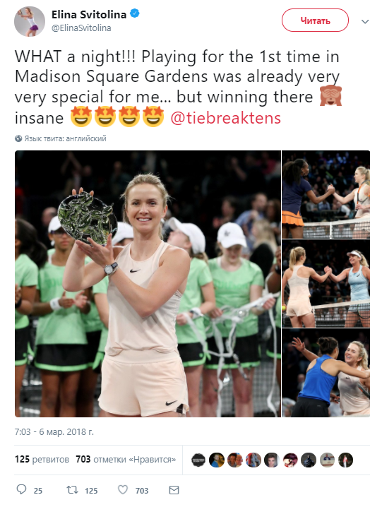 Четвертая ракетка мира, украинская теннисистка Элина Свитолина одержала победу на выставочном турнире Break Tens, который состоялся 5 марта на арене Madison Square Garden в Нью-Йорке.