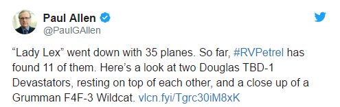 "Мы обнаружили USS Lexington спустя 76 лет после того, как он затонул. Поисковое судно RV Petrel обнаружило авианосец и самолеты времен Второй мировой войны на глубине более трех тысяч метров в Коралловом море близ Австралии", - говорится в сообщении.