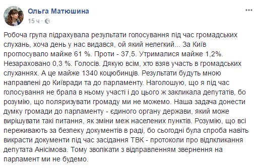 "Рабочая группа подсчитала результаты голосования во время общественных слушаний, хотя день у нас выдался, ой какой нелегкий. За Киев проголосовало почти 61%. Против - 37,5%. Воздержались почти 1,2%. Не засчитано 0,3% голосов", - написала Матюшина.