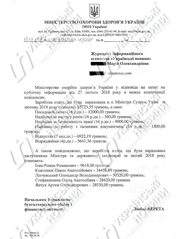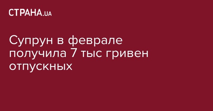 Сумма средств, начисленная Супрун в феврале, составила 35 723,55 гривны, из которых должностной оклад составляет 12 000 гривен, надбавка за выслугу лет - 360 гривен, надбавка за интенсивность труда - 9 000 гривен, надбавка за работу с секретными документами - 1 800 гривен, командировочные - 5 641,36 гривны, отпускные - 6 922,19 гривны.