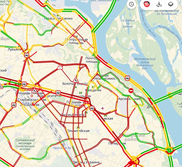 Также затор образовался на проспекте Победы (от центра и цирка в обе стороны, а также от метро "Политехнический институт" и до метро "Нивки"), на улице Елены Телиги (в сторону метро "Дорогожичи") и проспекте Степана Бандеры (в сторону Троещины).