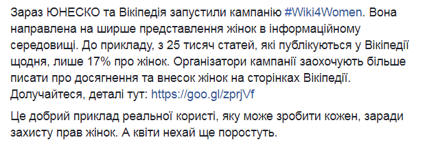 Сейчас ЮНЕСКО и Википедия запустили кампанию # Wiki4Women. Она направлена на более широкое представление женщин в информационной среде. К примеру, среди 25 000 статей, публикуемых в Википедии ежедневно, лишь 17% о женщинах. Организаторы кампании призывают больше писать о достижениях и вкладе женщин на страницах Википедии. Присоединяйтесь.