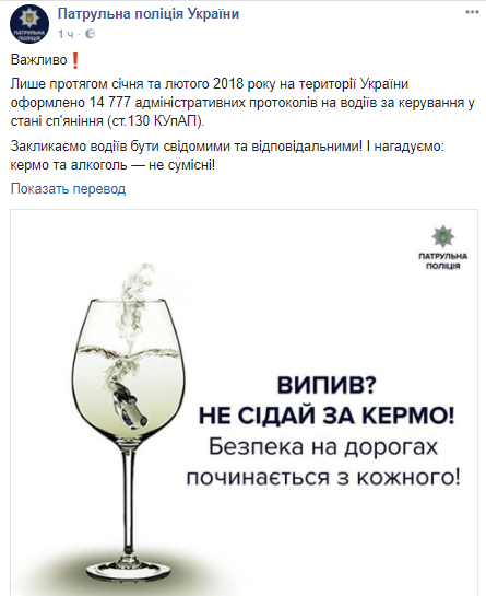 В январе-феврале 2018 года на территории Украины оформлено 14 тысяч 777 административных протоколов на водителей за управление в состоянии опьянения (алкогольного, наркотического или др.). Об этом сообщает пресс-служба патрульной полиции Украины на странице в Facebook.