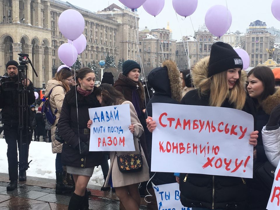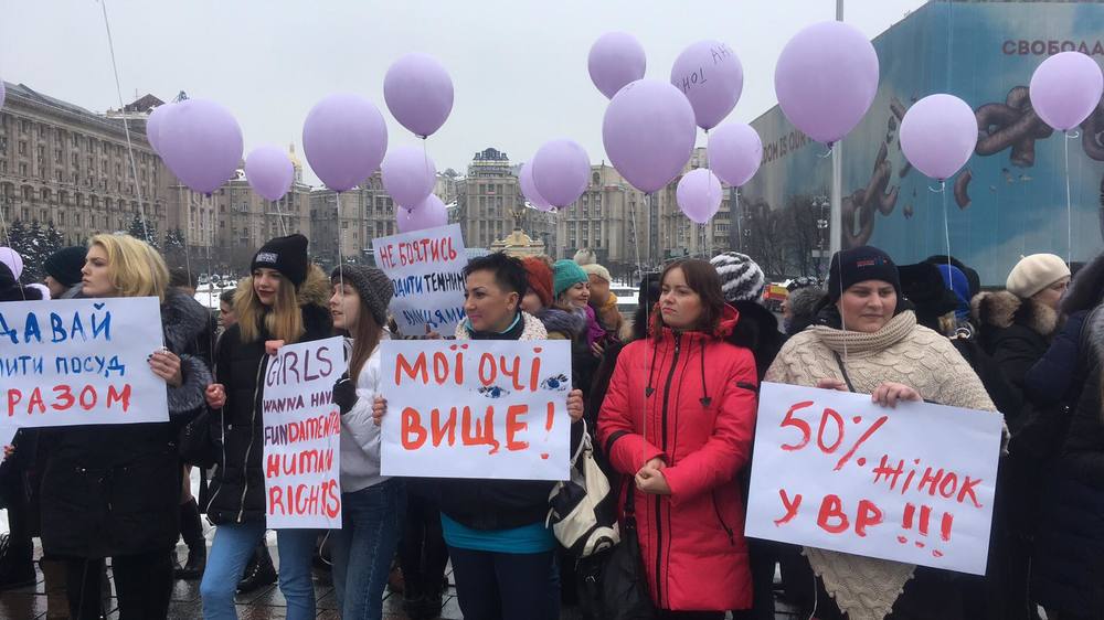 Среди лозунгов участников мероприятия - "Давай вместе мыть посуду", "Давай вместе воспитывать детей", "МАТИ вибір" (иметь выбор), "МАТИ можливості" (иметь возможности), "Мы - настоящие Национальные Дружины", "Хочу рожать детей, а не военных", "Дорогенька, я твій През", "Трюдо лучше Гройсмана, потому что феминист".