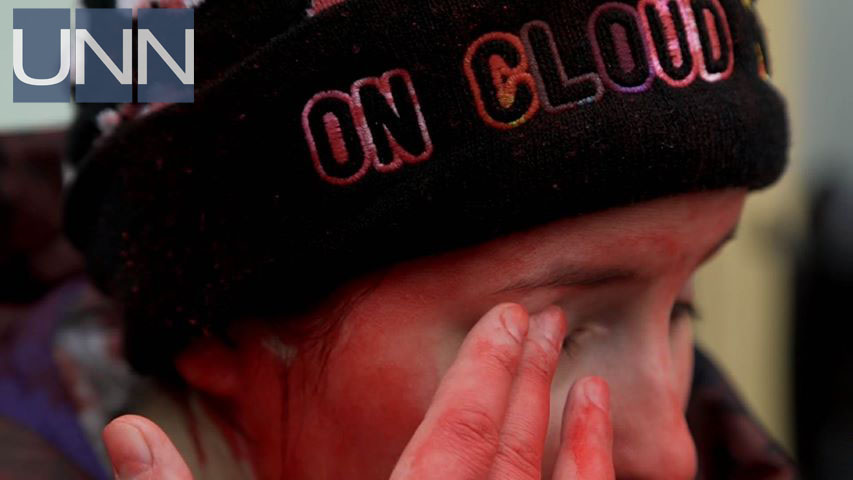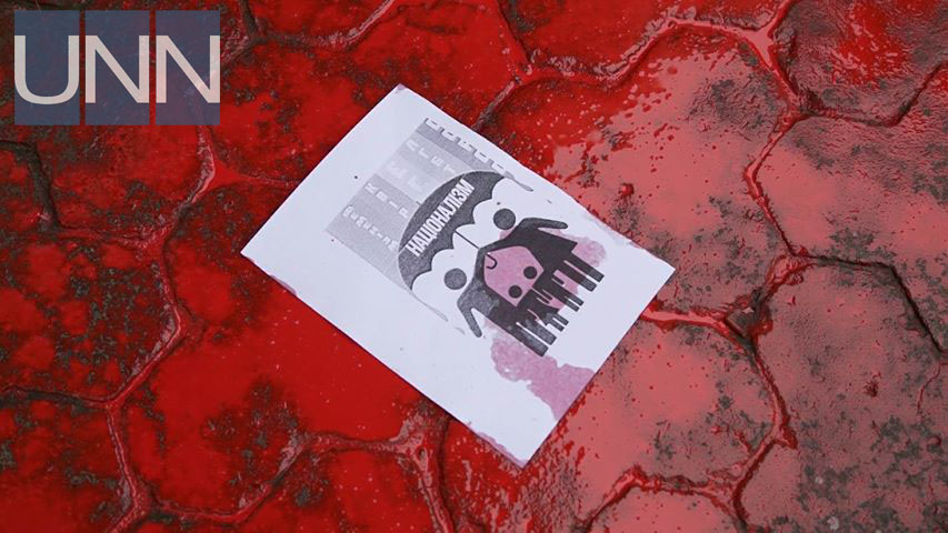 Девушек с плакатами облили красной краской, несмотря на то, что акция была анонсирована.