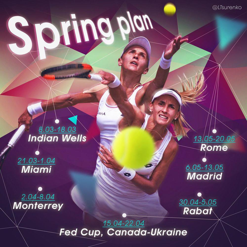 Леся Цуренко планирует сыграть на турнирах WTA в Монтеррее (со 2 апреля), Риме, Мадриде и Рабате, а также на Кубке Федерации против Канады (21-22 апреля).
