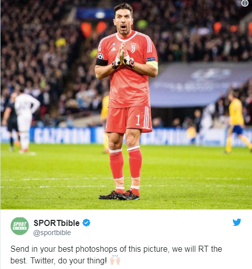 Пользователи Twitter начали активно создавать фотожабы, посвященные вратарю туринского Ювентуса Джанлуиджи Буффону и его фотографии, сделанной во время ответного матча 1\8 финала Лиги Чемпионов против Тоттенхэма.