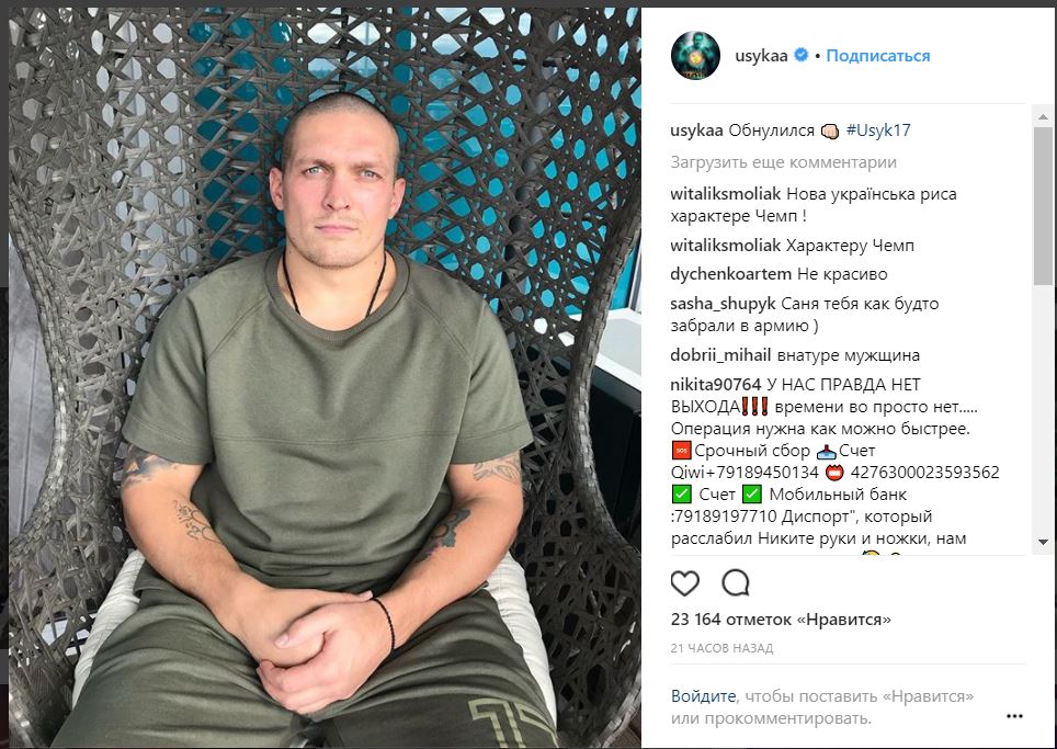Украинский тяжеловес Александр Усик постригся под ноль. Фото своего нового образа он опубликовал на странице в Instagram.