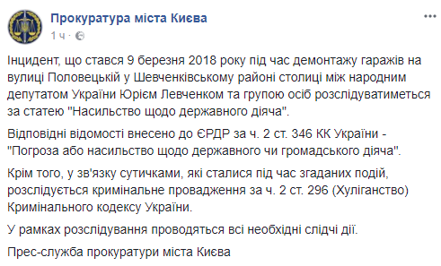 Инцидент между народным депутатом Украины Юрием Левченко и группой лиц, который произошел 9 марта во время демонтажа гаражей на ул.Половецкой в Шевченковском районе Киева, будет расследоваться по статье "насилие в отношении государственного деятеля".