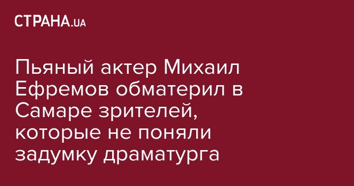 В Самаре 7 марта во время трагикомедии "Не становись чужим" актер театра "Современник" Михаил Ефремов вышел на сцену с опозданием более чем на полчаса. Зрители заявили, что актер находился в нетрезвом состоянии, путал текст и говорил тихо. После того, как его попросили говорить громче, актер ответил нецензурным выражением. Об этом сообщает ТАСС.