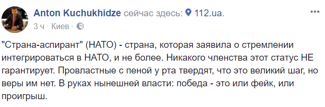 "Страна-аспирант" (НАТО) – страна, которая заявила о стремлении интегрироваться в НАТО, и не более. Никакого членства этот статус НЕ гарантирует. Провластные с пеной у рта твердят, что это великий шаг, но веры им нет. В руках нынешней власти: победа – это или фейк, или проигрыш", – вторит Филипчуку политолог Антон Кучухидзе.