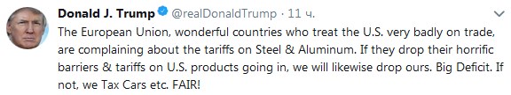 "Европейский союз, замечательные страны, которые относятся к США очень плохо в торговле, жалуются на тарифы на сталь и алюминий. Если они откажутся от своих ужасных барьеров и тарифов на товары США, мы также снимем наши пошлины. Большой дефицит. Если нет, мы введем налог на автомобили и т. д. Справедливо!", - заявил президент США.