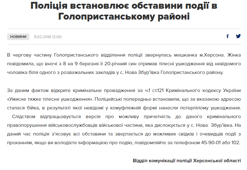 В полиции Херсонской области своя версия начала массовой драки военных с гражданскими в селе Новая Збурьевка, о чем ранее сообщала "Страна".