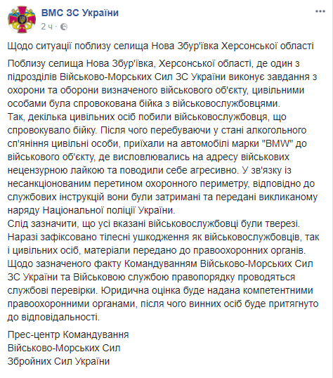 Инцидент был спровоцирован тем, что несколько гражданских лиц избили военнослужащего, сообщает в Facebook пресс-служба ВМС ВС Украины.