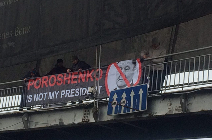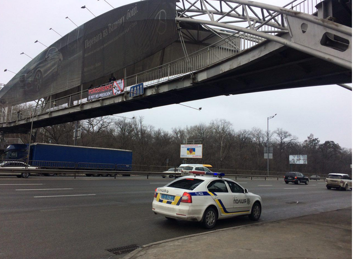 По словам сторонников Саакашвили, полиция заблокировала мост на Столичном шоссе, чтобы не дать вывесить плакат за отставку президента. На банере была надпись: "Poroshenko is not my President".