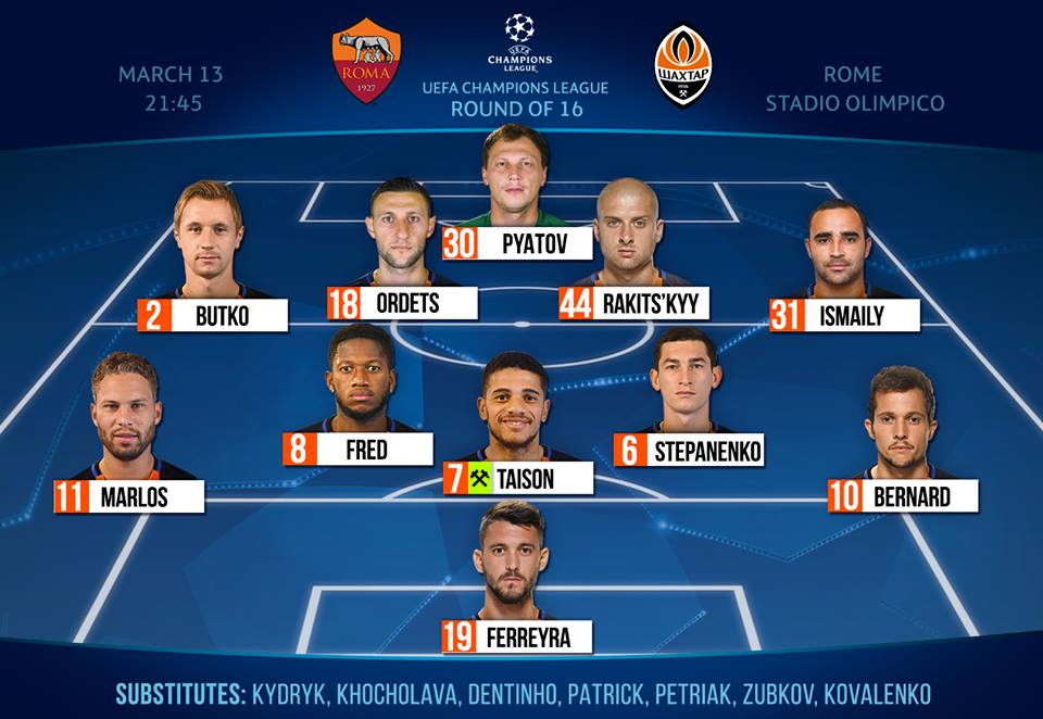 Шахтер: Пятов — Бутко, Ракицкий, Ордец, Исмаили — Степаненко, Фред — Марлос, Тайсон, Бернард — Феррейра