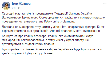 Сборная Украины по биатлону не будет участвовать в финальном этапе Кубка мира, который состоится в российской Тюмени. Об этом министр молодежи и спорта Украины Игорь Жданов, который ранее предлагал бойкотировать этот чемпионат, написал в Facebook.