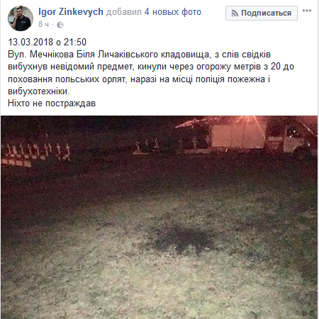Депутат Львовского горсовета Игорь Зинкевич уточнил в Facebook, что взрыв произошел в 20 метрах от польского Мемориала орлят на ул. Мечникова.