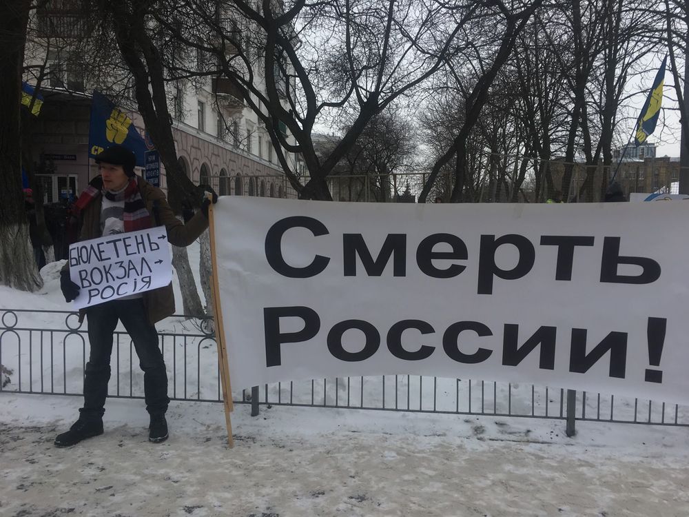 11:56  Вот такими "мотивирующими" плакатами встречают в Киеве россиян,  желающих проголосовать за президента РФ. Неудивительно, что никто не приходит.