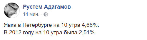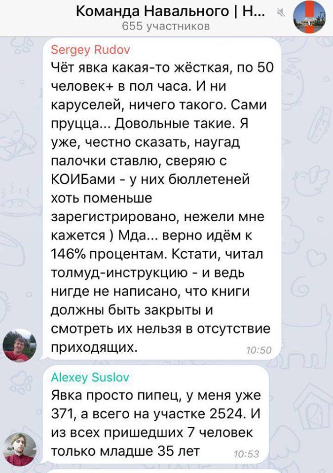 8:53  Российский оппозиционный блогер Рустем Агадамов со ссылкой на активистов Навального пишет, что явка высокая. И приводит отрывок из переписки.