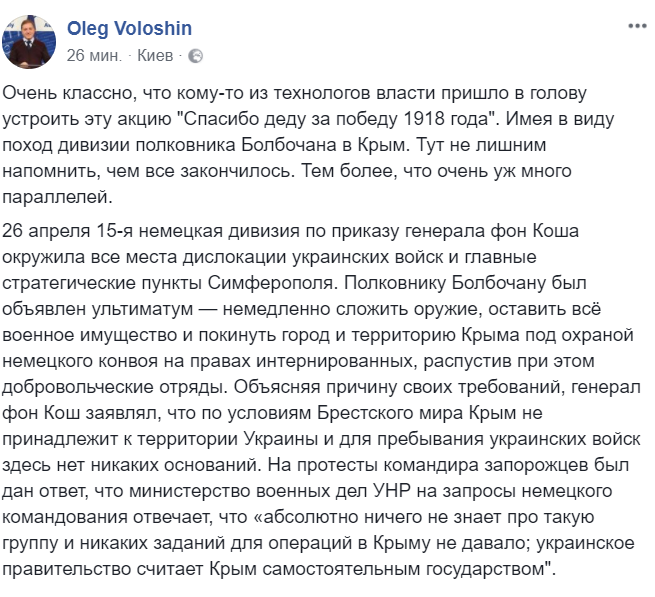 "Очень классно, что кому-то из технологов власти пришло в голову устроить эту акцию "Спасибо деду за победу 1918 года". Имея в виду поход дивизии полковника Болбочана в Крым. Тут не лишним напомнить, чем все закончилось. Тем более, что очень уж много параллелей.