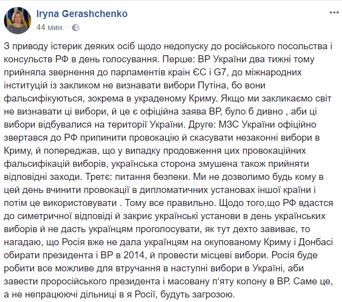13:50  Вице-спикер Ирина Геращенко рассказала, почему россиянам не дали проголосовать в Украине. По ее словам, это ответная акция на то, что украинцам в Крыму не дали проголосовать за президента Украины в мае 2014 года.