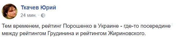 11:23  "Тем временем, рейтинг Порошенко в Украине - где-то посередине между рейтингом Грудинина и рейтингом Жириновского", - пишет журналист Юрий Ткачев.
