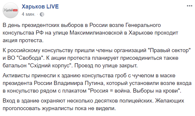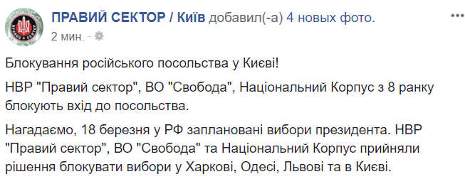 Напомним, 18 марта в РФ запланированы выборы президента. НВР "Правый сектор", ВО "Свобода" и Национальный Корпус приняли решение блокировать выборы в Харькове, Одессе, Львове и в Киеве", - говорится в Facebook Правого сектора.