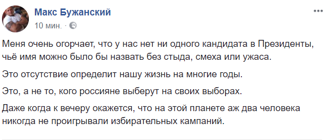 "Меня очень огорчает, что у нас нет ни одного кандидата в Президенты, чьё имя можно было бы назвать без стыда, смеха или ужаса.