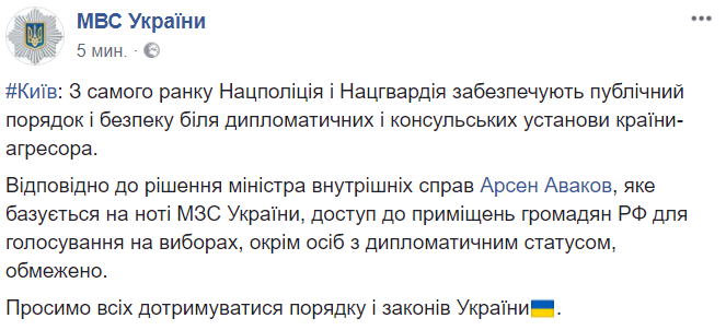 "С самого утра Нацполиция и Нацгвардия обеспечивают общественный порядок и безопасность у дипломатических и консульских учреждения страны-агрессора.