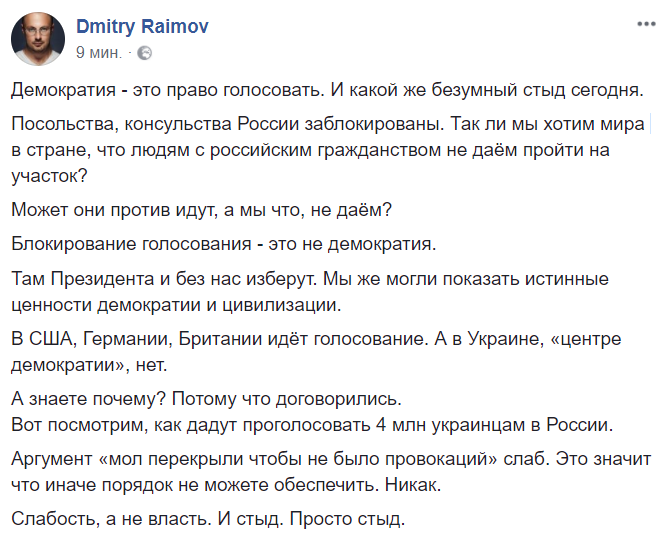 Аргумент "мол перекрыли чтобы не было провокаций" слаб. Это значит, что иначе порядок не можете обеспечить. Никак. Слабость, а не власть. И стыд. Просто стыд", - пишет политтехнолог Дмитрий Раимов.