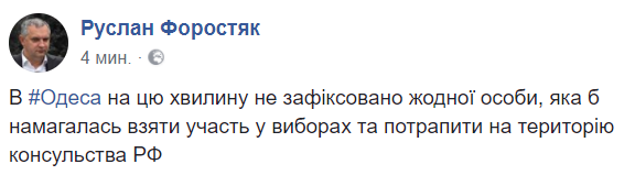 10:48  В одесской полиции рапортуют: "На эту минуту не зафиксировано ни одного человека, который бы пыталась принять участие в выборах и попасть на территорию консульства РФ". Ну еще бы.