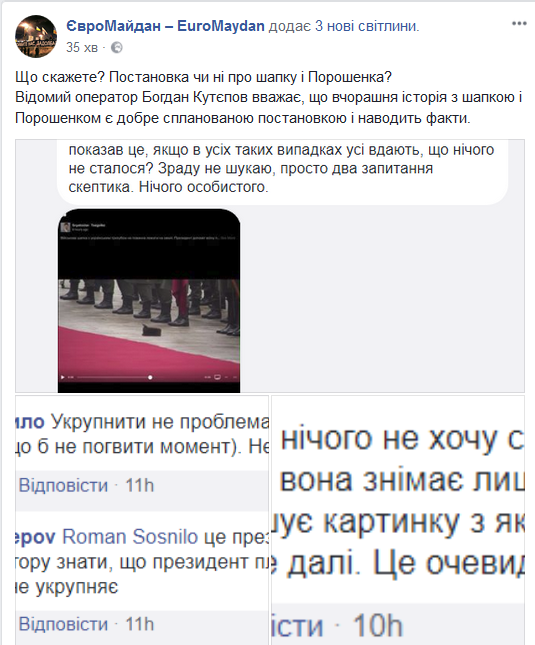Также в Facebook Евромайдана, со ссылкой на оператора Богдана Кутепова, появилось мнение, что история с шапкой - хорошо срежессирована.