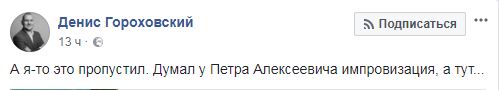 "А я-то это пропустил. Думал у Петра Алексеевича импровизация, а тут...", - написал политэксперт Денис Гороховский в своем Facebook.