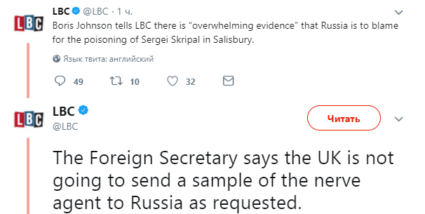 "Глава МИД заявляет, что Великобритания не собирается посылать образец нервно-паралитического вещества в Россию, как было запрошено", - говорится в посте LBC.