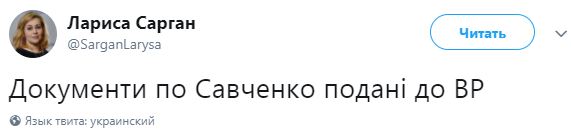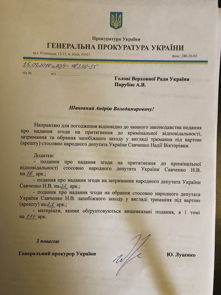 Генеральная прокуратура Украина внесла представление на снятие неприкосновенности, привлечение к уголовной ответственности и арест с народного депутата (внефракционная) Надежды Савченко.
