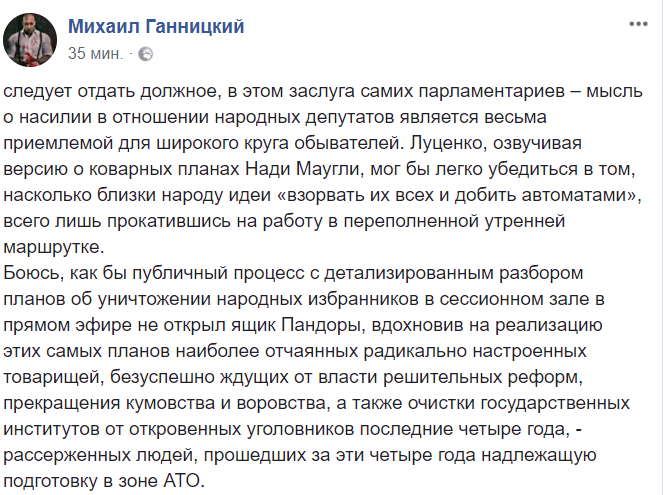 "В этом заслуга самих парламентариев – мысль о насилии в отношении народных депутатов является весьма приемлемой для широкого круга обывателей. Луценко, озвучивая версию о коварных планах Нади Маугли, мог бы легко убедиться в том, насколько близки народу идеи "взорвать их всех и добить автоматами", всего лишь прокатившись на работу в переполненной утренней маршрутке.