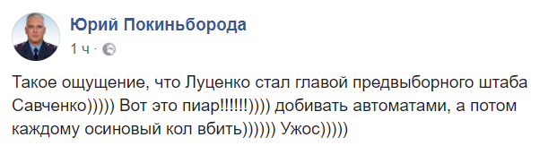 "Такое ощущение, что Луценко стал главой предвыборного штаба Савченко. Вот это пиар! Добивать автоматами, а потом каждому осиновый кол вбить. Ужос", - говорят АТОшник Юрий Покиньборода.