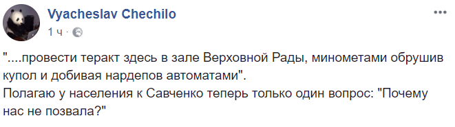 Я уже представляю себе суровых АТОшников, которые под командованием Савченко и Рубана, буквально с ночи оборудовали в сессионном зале минометные позиции, расставляли пулеметные гнезда и складывали гранаты, заранее просчитывая траектории полета мин. А утром депутаты брели бы в зал, как на заклание, отчетливо осознавая неотвратимое...", - описывает предполагаемую бойню журналист Денис Попович.