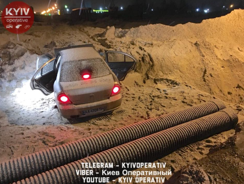 Инцидент произошел на улице Богатырской в Оболонском районе города. Водитель Nissan слетел с дороги и попал прямо в котлован. Он был госпитализирован с травмой ноги. На месте работали патрульные.