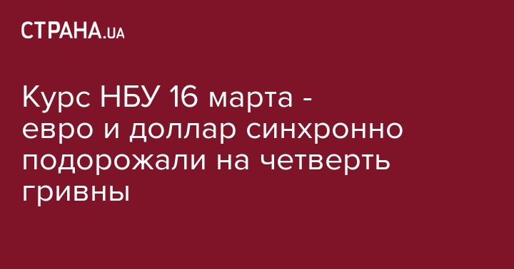 В пятницу, 16 марта, Нацбанк установил официальный курс гривны по отношению к иностранным валютам. По сравнению с предыдущим рабочим днем евро и доллар прибавили в цене четверть гривны.