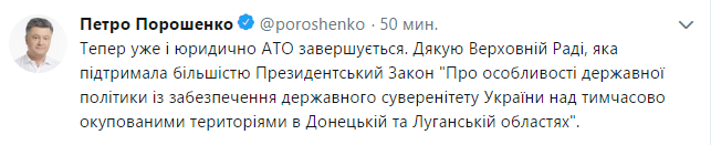 "Теперь уже и юридически АТО завершается. Спасибо Верховной раде, которая поддержала большинством президентский закон", — написал Порошенко.
