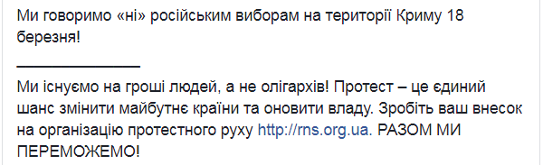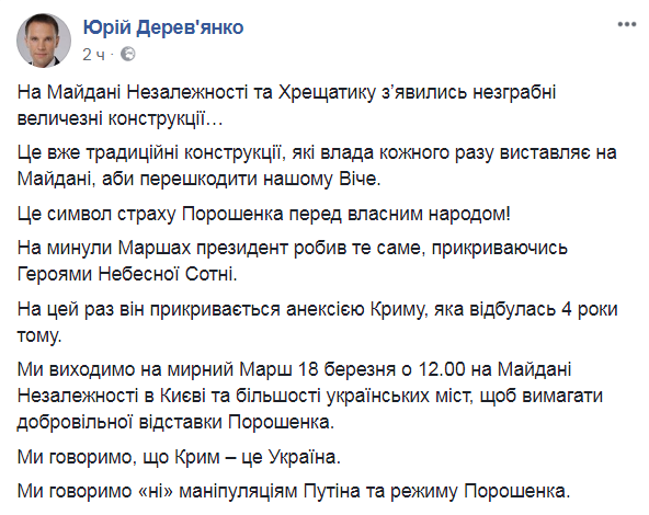 "Мы выходим на мирный Марш 18 марта в 12:00 на Майдане Независимости в Киеве и большинстве украинских городов, чтобы потребовать добровольной отставки Порошенко. Мы говорим, что Крым - это Украина. Мы говорим "нет" манипуляциям Путина и режима Порошенко. Мы говорим "нет" российским выборам на территории Крыма 18 марта", - подчеркнул Деревянко.