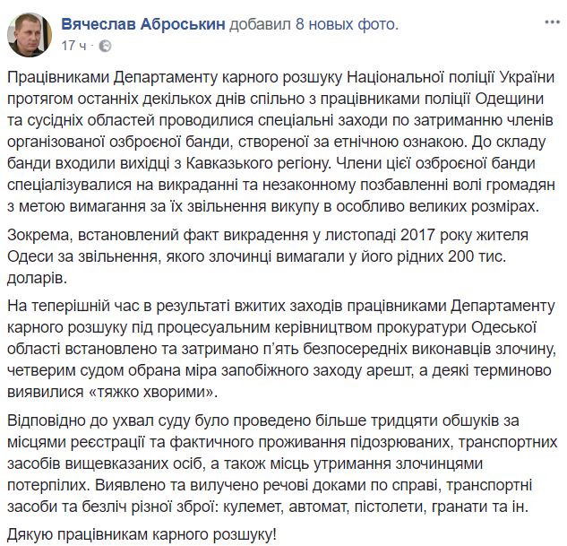 Бандитов подозревают в похищении жителя Одессы в октябре 2017 года, у родных которого вымогали 200 тысяч долларов. При задержании у членов группировки изъяли солидный арсенал: пулемёт, автомат, помповое ружьё, пистолеты, гранаты.