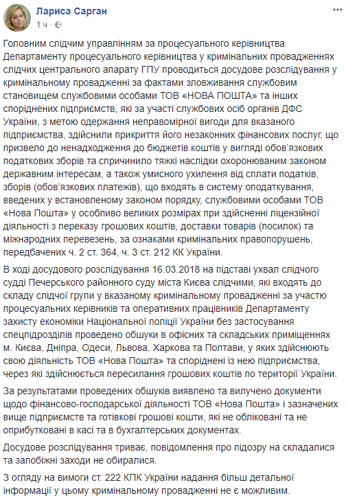 Проводится досудебное расследование в уголовном производстве по фактам злоупотребления служебным положением должностными лицами ООО "Нова пошта" и других родственных предприятий, которые при участии должностных лиц Государственной фискальной службы, с целью получения неправомерной выгоды для "Новой Почты", осуществили "прикрытие его незаконных финансовых услуг".